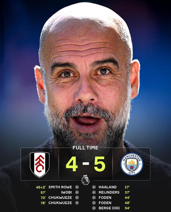 仅仅过了6分钟,富勒姆角球再度制造混乱,曼城二点再次空虚,丘库埃泽直接迎球抽射完成梅开二度,富勒姆4-5曼城,从1-3到1-5再到4-5,农场主的反扑太疯狂了,曼城的后防也太菜了,短短21分钟连丢3球,试问这样的球队,怎么跟阿森纳争冠呢?最终比分也定格在此,曼城有惊无险5-4拿下对手,拿下英超2连胜。